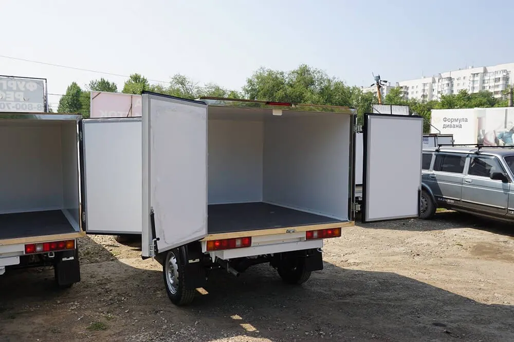 Описание для фургонаВнешняя обшивка – крашенная оцинкованная сталь, внутренняя обшивка - пищевая оцинкованная сталь, пол – рифлёный алюминий, портал - нержавеющая сталь. Двери - задние распашные. Запоры штанговые одинарные. Фургон выполнен под установку холодильного оборудования в Новосибирске.