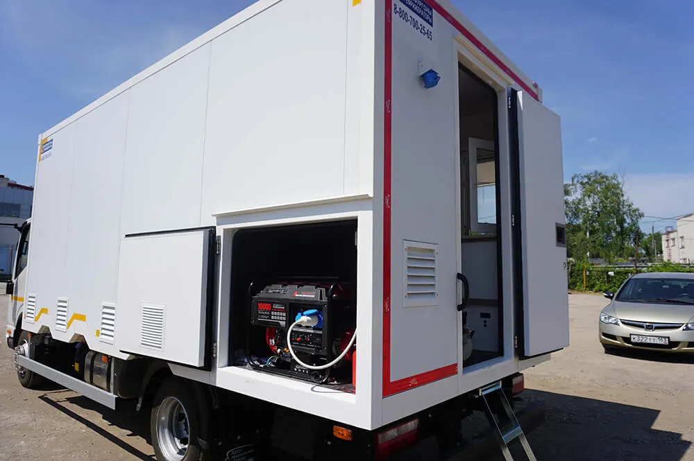 Внутренние размеры фургона 4700х2080х2030 мм или могут быть увеличены. Передвижной магазин представляет собой шасси с автолавкой, которая включает в себя удобный холодильный шкаф с витриной и гардеробный шкаф с дверью. В ДЖАК 80 предусмотрено автономное водоснабжение.